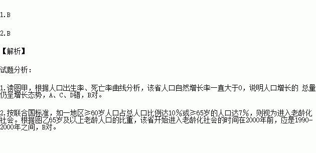 读“某省人口出生率、死亡率变化图”(图甲)和“年龄结构变化图”(图乙)。据此回答下列各题。