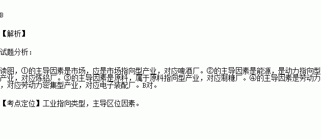 读下图“炼铝厂、制糖厂、电子装配和啤酒厂四种工业布局模式”,判断①~④说法正确的是( )