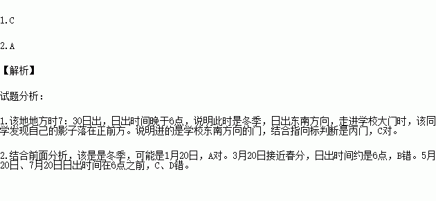 就读于我国某大学的李同学,于某日日出时刻早晨7:30 (地方时)走进学校大门时,发现自己的影子落在正前方。据此,读下图回答下列各题。