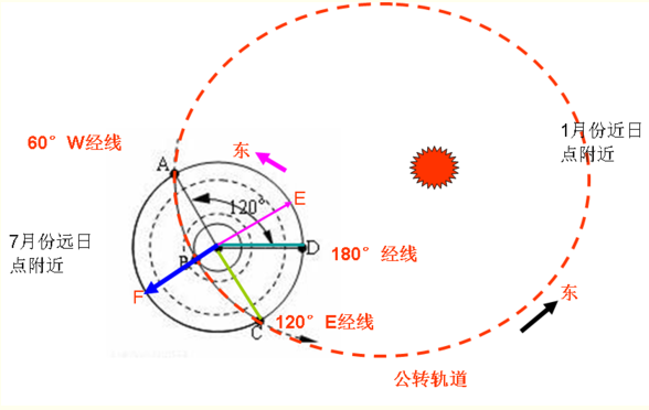 解答 解:公转方向是逆时针,判定途中同心圆心是北极点,D点所在经线是日期界线(零点经线或日界线),由已知条件可判定D所在经线为日界线,即180°经线,推知A点西经60°,位于昏线,地方时为18时;C点120°E,位于晨线,地方时为6时,E点所在经线是白天的中间--地方时为正午12时,F点所在经线是黑夜的中间--地方时为今天的24时或第二天的0时.北极圈内有极昼现象,所以地球公转到远日点附近,即7月前后,远日点地球角速度小于1°/日,上海一年中白昼最长时,北极圈内全部是极昼,而图中极圈内大部分是判定是6月22日以前,或6月22日以后.东八区(中央经线=15°X8=东经120°经线)为晨线,6时,而东经位于东九区,比北京早一小时,地方时为8时,太阳高度已经大于0°下图:![]()