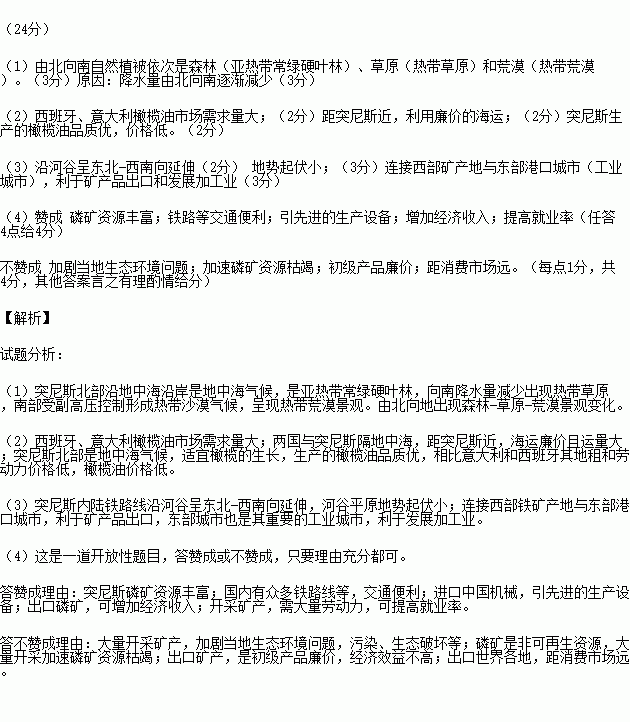 (1)说出突尼斯由北向南自然植被的变化,并简述其原因。