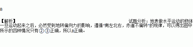 下图中,虚线箭头表示水平运动物体的原始运动方向,实线箭头表示受地转偏向力影响后实际的运动方向,图中所示四种情况,正确的是( )