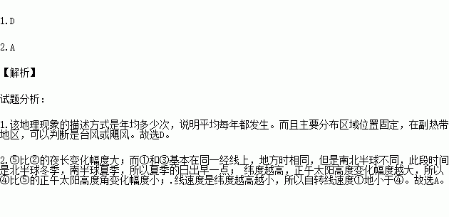C. ④比⑤的正午太阳高度角变化幅度大 D.自转线速度①地大于④地