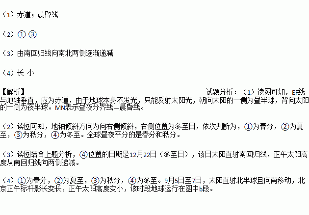 (2)①、②、③、④四个位置中,全球昼夜平分的是 、 。