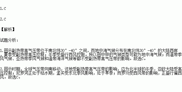 1.图中所描述的阴影区域若在大陆西岸,其气候类型可能是 ( )