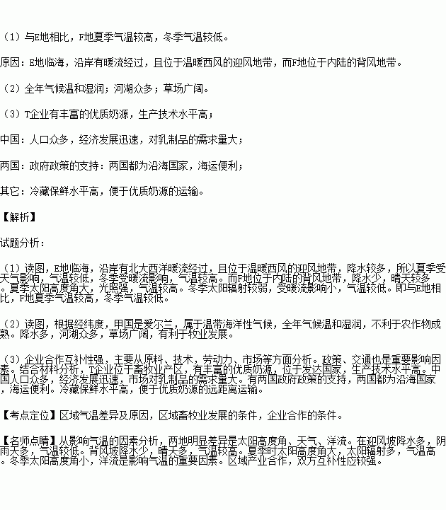 图中甲国的奶牛全年有近10个月是在天然草场上放牧,加工乳制品时严格执行欧盟标准.2014年 11月,甲国T企业与我国H企业在北京签署了合作备忘录,由T企业提供奶源,在中国进行乳制品生产.