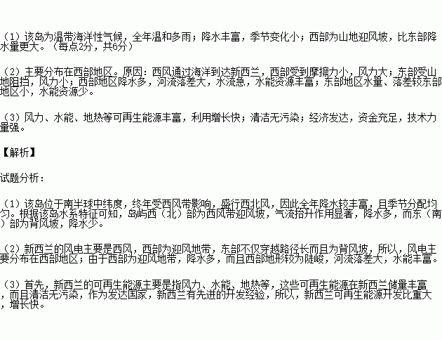 (2)推测新西兰南岛水电、风电共同的分布特点,并说明原因。