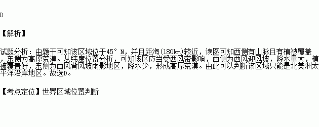 下图为45°N附近某区域的遥感影像,其中深色部分为植被覆盖区,浅色部分为高原荒漠区;终年冰雪覆盖的山峰海拔3 424米,距海约180千米。读图,该区域位于 ( )