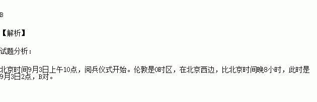 2015年9月3日上午10点整,纪念中国人民抗日战争暨世界反法西斯战争胜利70周年阅兵仪式正式开始,身在伦敦的华人想观看直播应于何时观看
