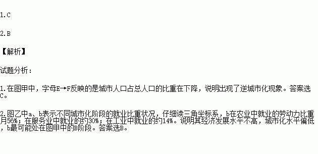 2.图乙中a、b表示不同城市化阶段的就业比重状况,其中b最可能处在图甲中的