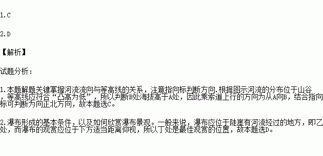 2.图中有一瀑布,瀑布及其最佳观赏的位置分别是( )