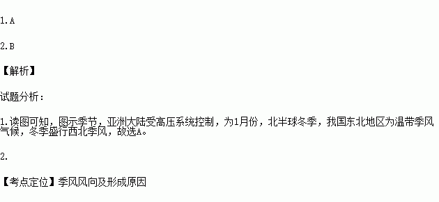 A.1月、西北风 B.7月、西北风 C.1月、东南风 D.7月、东南风