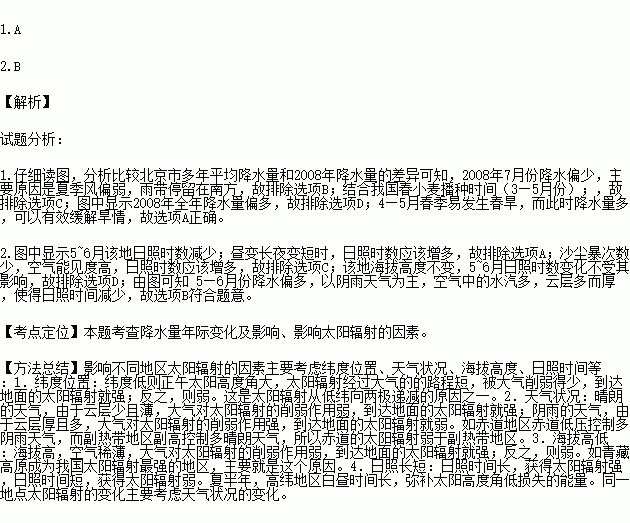 下图为“北京市年降水量与年日照时数统计图”,其中日照时数主要与昼夜长短、天气状况、海拔等因素有关。读下图,完成下题。