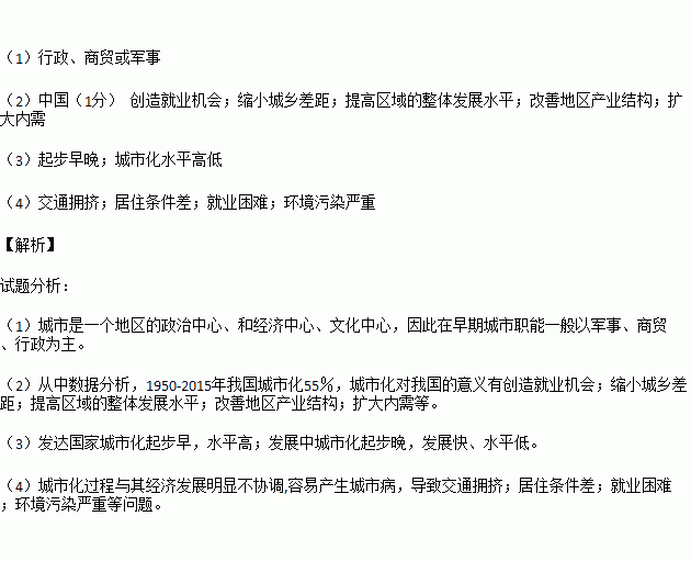 (2)图示国家中,1950-2015年我国城市化速度最快,城市人口比重约上升了 ,目前城市化对我国的意义有 。