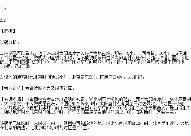 D.北京时间12点时该地太阳高度达一天中最大值