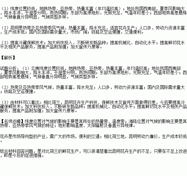 (2)结合材料和所学知识,分析昆明发展花卉生产的有利条件。