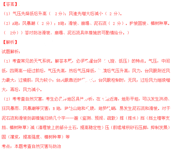 (2)该台风在A、B两地引发的主要次生灾害有何不同?说明B地预防这些次生灾害的工程措施。(6分)