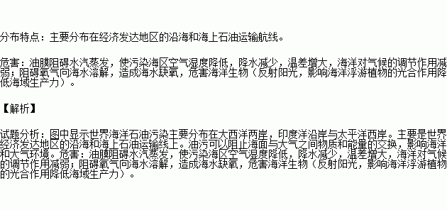 指出世界海洋石油污染的主要分布特点,分析海面油膜对污染海域气候和海洋生物的危害。