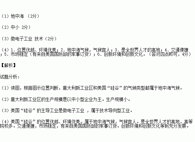 (1)意大利新工业区和美国“硅谷”的气候类型都属于 气候。(2分)