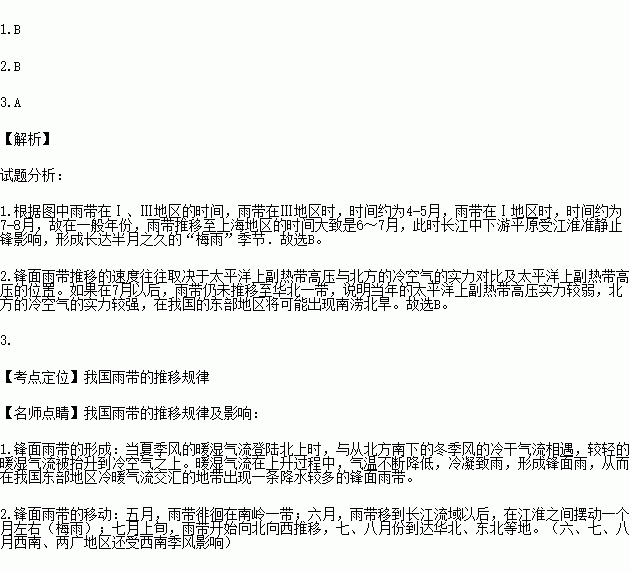 1.根据雨带在Ⅱ、Ⅲ地区的时间,可以推断出在一般年份雨带推移到上海地区的时间大致是