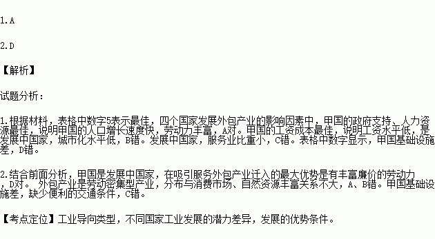 服务外包指发达国家将非核心的IT服务业外包给成本更低的专业服务提供商。下表是四个国家服务外包产业发展潜力对比表(5表示最佳)。读表完成下列各题。