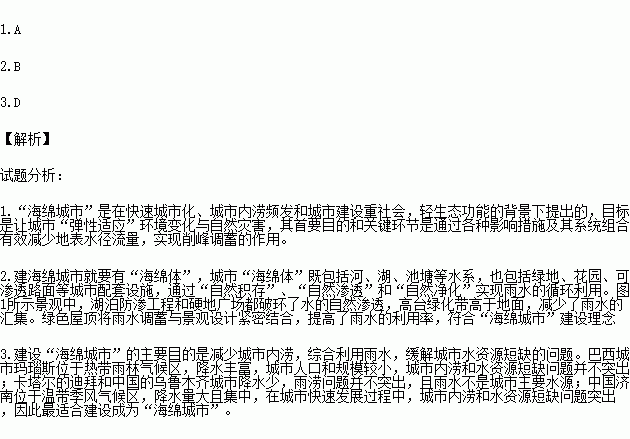 “海绵城市”是指城市在适应环境变化和应对自然灾害等方面具有良好的“海绵性”,下雨时能够吸水、蓄水、渗水、净水,需要时将蓄存的水“释放”并加以利用。据此完成各题。
