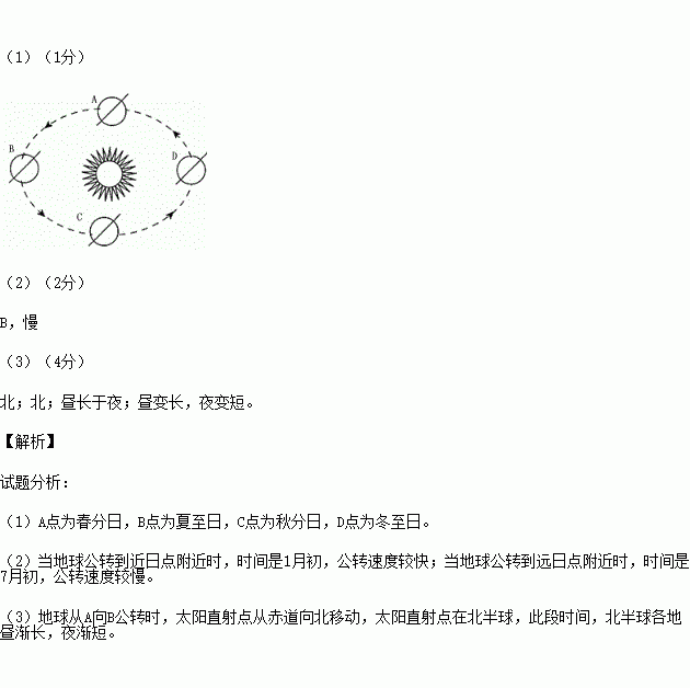 (2)地球绕日公转在左图中的 点时,最接近远日点位置,其公转速度较 。(2分)