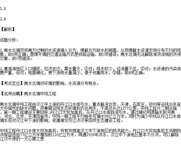 1.下列有关南水北调中线工程的影响,叙述正确的是( )