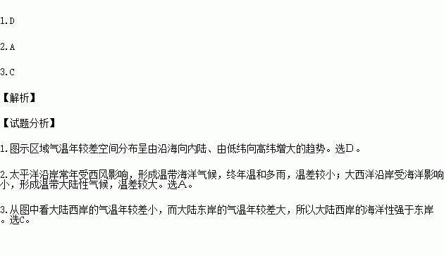 2.导致太平洋沿岸气温年较差小于大西洋沿岸的主要因素是