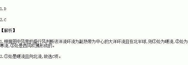 2.流经①处的洋流流向与下列四幅图所示一致的是( )