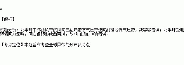 下列箭头能代表北半球中纬西风带的风向的是( )