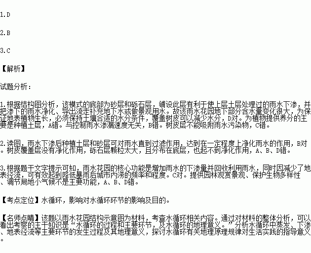 ÓêË®»¨Ô°ÊÇÒ»ÖÖÄ£·Â×ÔÈ»½çÓêË®»ã¼¯¡¢ÉøÂ©¶ø½¨ÉèµÄdz°¼Â̵أ¬Ö÷ÒªÓÃÓÚ»ã¾Û²¢ÎüÊÕÀ´×ÔÎݶ¥»òµØÃæµÄÓêË®£¬²¢Í¨¹ýÖ²Îï¼°¸÷Ìî³ä²ãµÄ×ÛºÏ×÷ÓÃÊ¹ÉøÂ©µÄÓêË®µÃµ½¾»»¯¡£¾»»¯ºóµÄÓêË®²»½ö¿ÉÒÔ²¹¸øµØÏÂË®£¬Ò²¿ÉÒÔ×÷Ϊ³ÇÊо°¹ÛÓÃË®¡¢²ÞËùÓÃË®µÈ¡£ÏÂͼʾÒâÓêË®»¨Ô°½á¹¹¡£¾Ý´ËÍê³ÉÏÂÁи÷Ìâ¡£