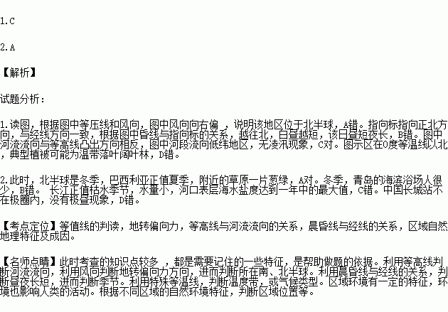 读“中纬度某地某日河流、风向、等压线、等高线、最冷月均温等温线、昏线的组合图”,回答下列各题。