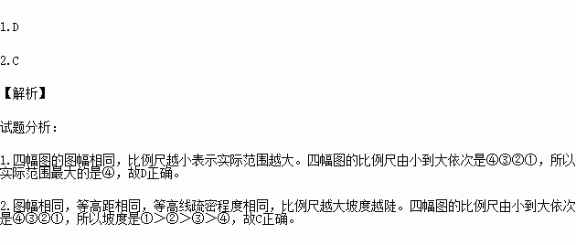 2.四幅图中等高距相同,下列坡度大小判断正确的是