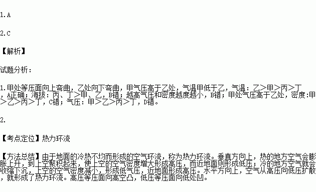 C.密度:乙>甲>丁>丙 D.气压:甲>丙>乙>丁