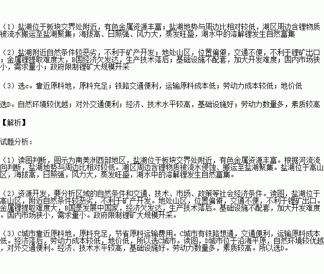 (3)某跨国企业欲开发A湖的金属锂资源,计划在c或D城市建提炼厂,你认为应选建在 哪一城市,请说明理由。