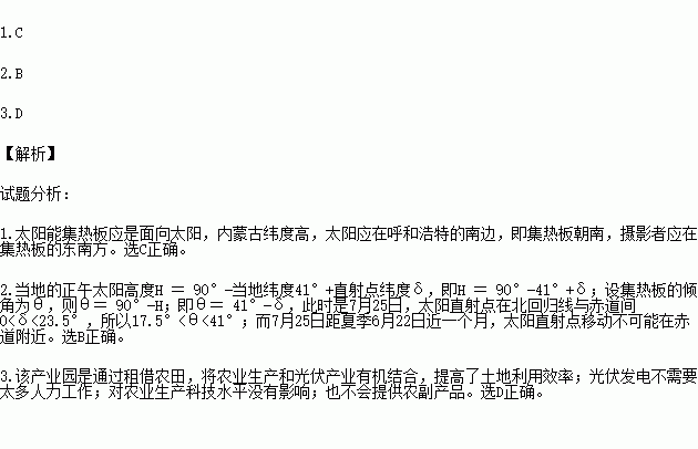 下图为某游客于2015年7月25日在内蒙古呼和浩特市郊区(约41°N)某光伏发电产业园区一角拍摄的照片,该产业园通过租借农田,将农业生产和光伏产业有机结合。