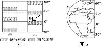 如图1为“气压带和风带季节移动示意图”,图2为“世界海陆分布的局部图”.读图回答下列问题.