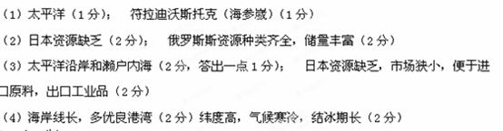 (4)日本是岛国,海岸线长且曲折,便于建设优良港口。而俄罗斯的海岸线虽漫长,但所处纬度较高,气候寒冷,冬季结冰期长,不利于水运发展。