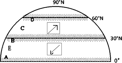 (2)根据风从高压带吹向低压带,北半球右偏,画出各个风带的风向.0-30°之间近地面的风带是信风带,北半球风向是东北风.30-60°之间的近地面风带是西风带,北半球风向是西南风.60°--90°之间的近地面风带是极地东风带,北半球风向是东北风.C是西南风,E是东北风.