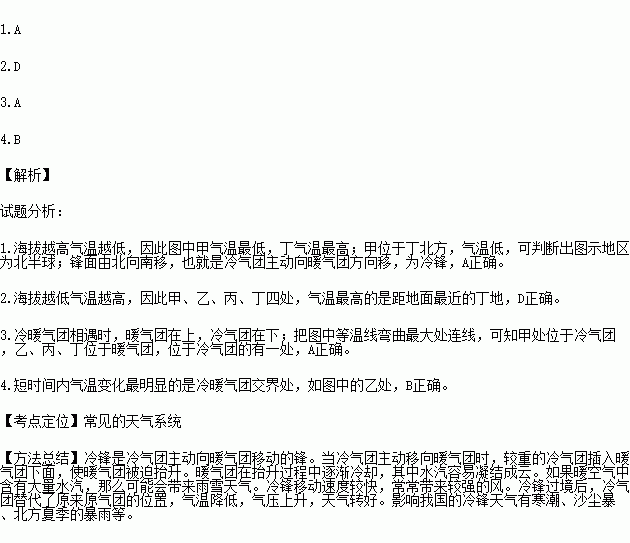 3.甲、乙、丙、丁四处,位于冷气团中的有