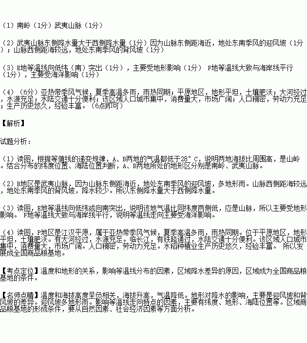 (3)分别简述等温线在E、F两地的走向特点及原因。