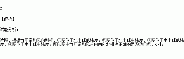 读气压带和风带位置示意图,图中气压带和风带由南向北排序正确的是 ( )