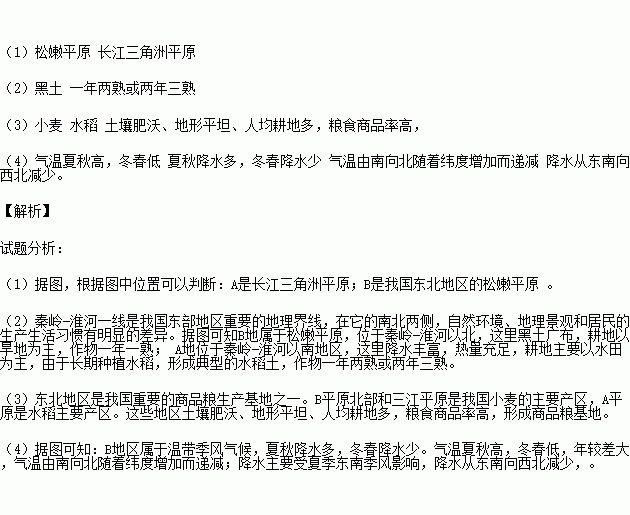 (3)东北地区是我国重要的商品粮生产基地之一。其中,B平原北部和三江平原是 主要产区(1分),A平原是 主要产区(1分)。请简要分析这些地方形成商品粮基地的自然因素?(2分)