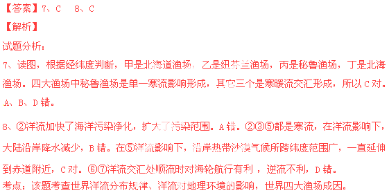 下图为世界四大渔场附近洋流分布图。读图回答7~8题。