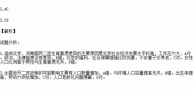 1.造成北京、河南居民二孩生育意愿差异的主要原因是北京