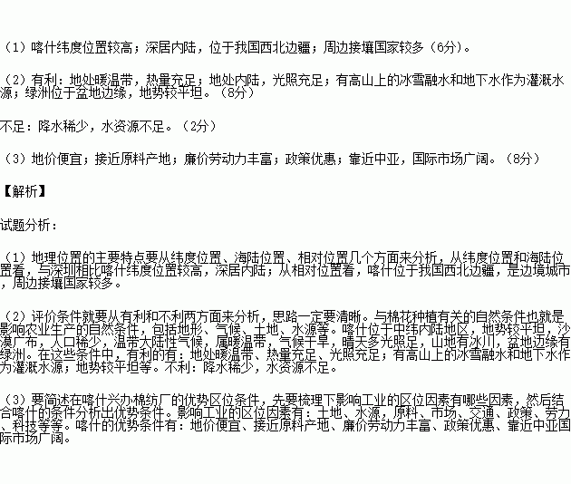 (3)简述在喀什兴办棉纺厂的优势区位条件。(8分)