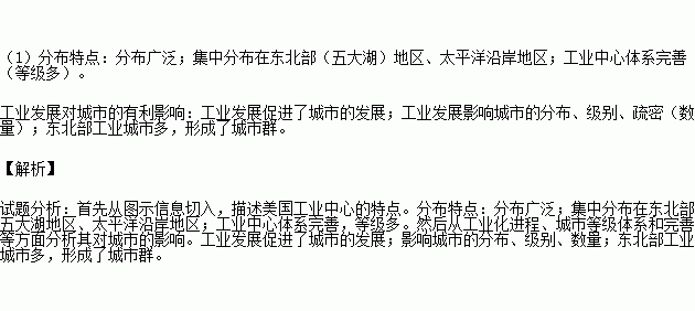 (1)描述美国工业中心的特点,并简述美国工业发展对城市的有利影响。