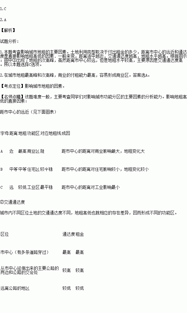 下图是某城市土地利用付租能力距离递减示意图,完成下列各题。