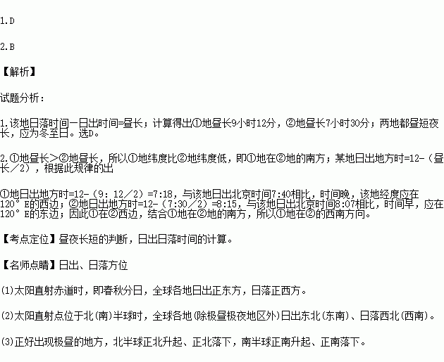图是我国①②两地某日的日出日落示意图(图示为北京时间),回答下列问题。